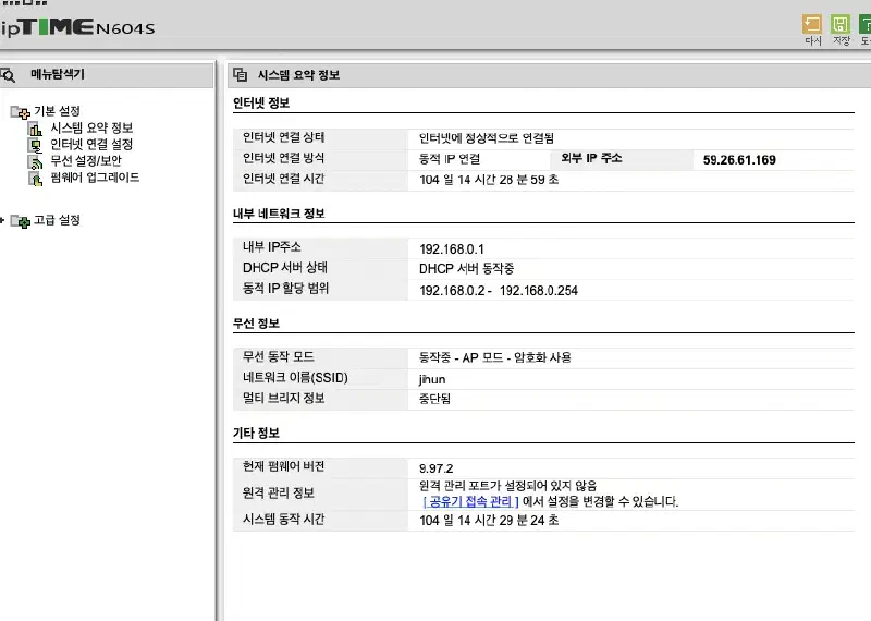 IP 주소 알아내기3 July 2022·26 words·1 min· loading DEV 2022맥curl ifconfig.me ->외부 (59.26.61.169)ipconfig getifaddr en0 -> 내부아이피59.26.61.169 로 접속하면 공유기 환경설정이 나옴내부아이피주소 == gateway address외부아이피 주소 == public ip address