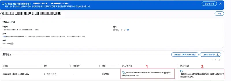 NAME에 CNAME이름(1), Target에 CNAME값(2)을 설정하고 잠시 기다리면, 상태가 인증 중으로 바뀐다.