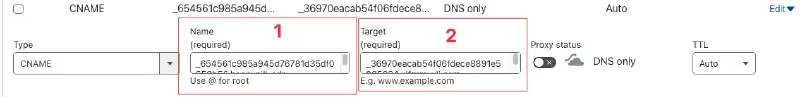 여기서 ACM에 DNS 검증을 위해 CNAME 레코드를 제시하는데, 이를 CloudFlare DNS에 추가한다 (proxy는 설정하지 않는다)