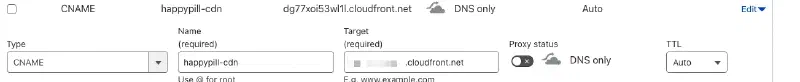 CloudFlare에서 이전 단계의 Alternative domain name에 입력한 도메인으로, CloudFront의 원본 URL을 매핑한다. proxy는 사용하지 않는다.