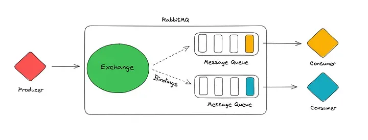 - Exchange: Producer로부터 받은 메시지를 Binding 규칙과 Routing Key에 따라 적절한 Queue로 라우팅