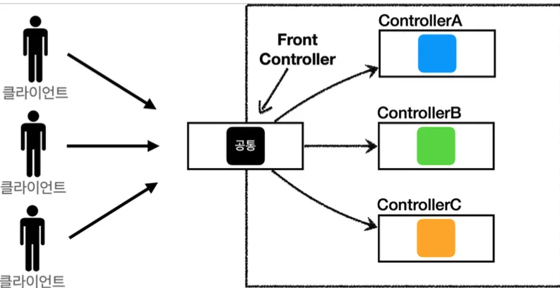 - 프런트 컨트롤러가 요청에 맞는 컨트롤러 호출 (입구 하나)